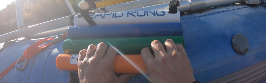 The Rapid Rung comes with two slots in the top for straps. Strap the Rapid Rung around your frame, D rings or a combination to get it right for your application. In whitewater where a flip is likely, attach the Rapid Rung near the midpoint of the tube ( between the waterline and the top of the tube) for easiest entry to an upside down boat. The easiest way to rig the ladder at the midpoint on row boats is to run a strap around the frame and then both ends of the strap through a d-ring or handle and then attach to the rung. Repeat on the other side. This keeps the rung from being under the boat in a flip. On a paddle boat the rung is best attached to a handle and a d ring or 2 d-rings. The d rings must be properly attached to the boat and be able to handle the weight of the ladder and the person climbing it. Only you can decide the best and safest application for your use. Check out the gallery to see some rigging pics or the video page to see the ladder rigged to flip and in action.